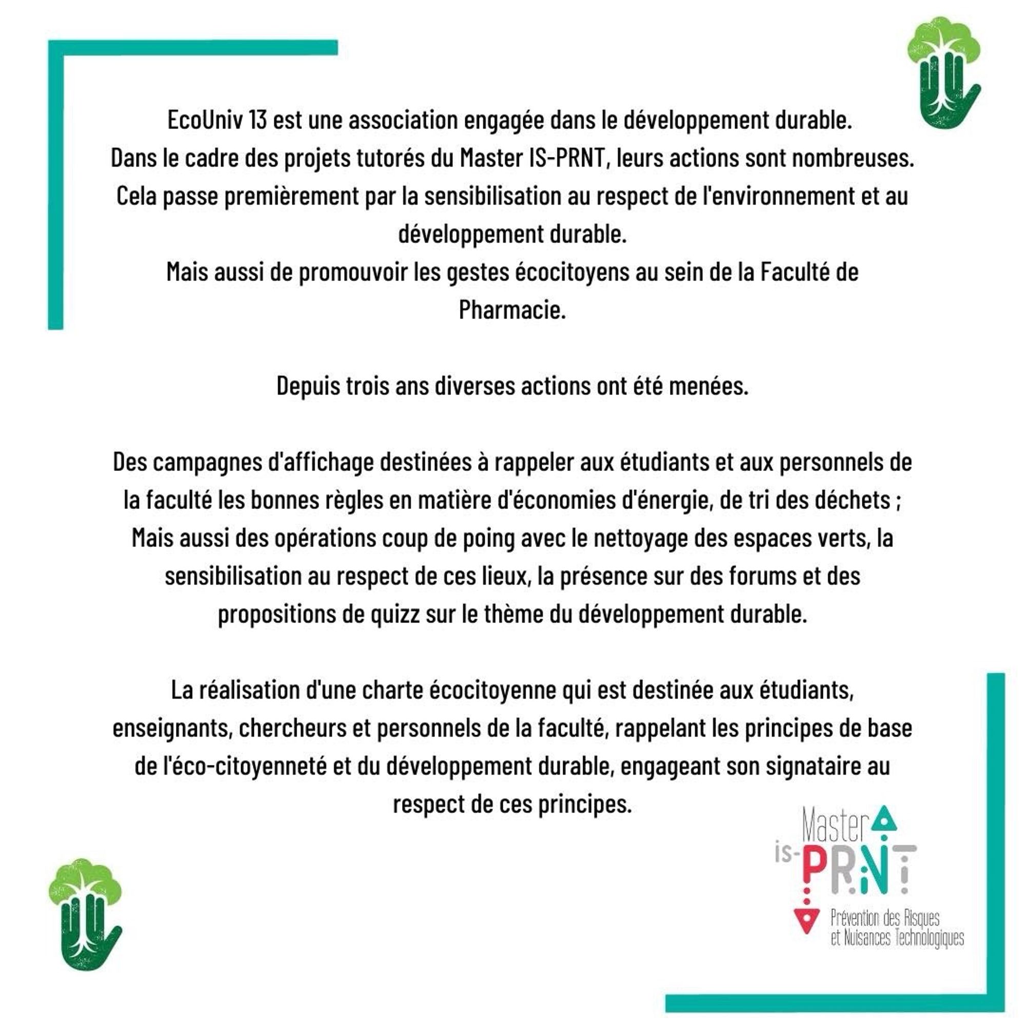 aujourd'hui nous vous présentons, dans le cadre des projets tutorés du Master IS-PRNT, l'association Eco univ 13.