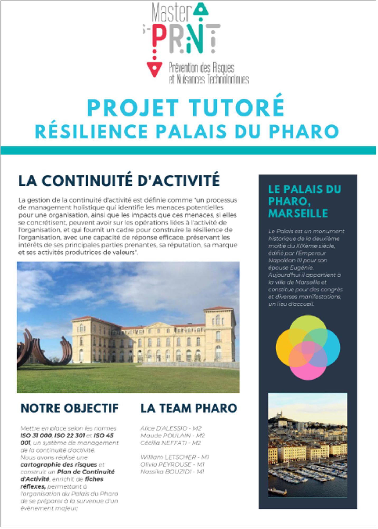 [Projet Tutoré] - Résilience Palais du Pharo 24 Mai 2021 Dans le cadre du Master PRNT, 6 étudiants ont mis à disposition du Palais du Pharo leurs compétences et connaissances, afin de permettre au palais d’avoir une gestion des risques intégrée et adaptée à son activité. Le groupe COM