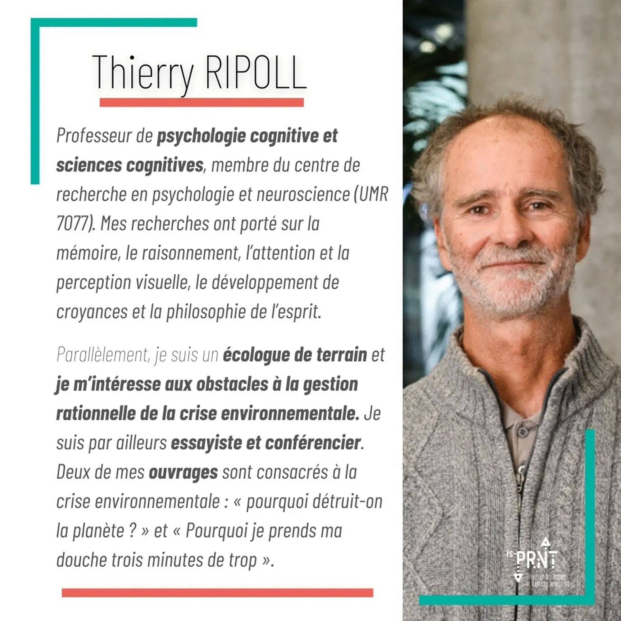 L'association ECOUNIV13 et le Master isPRNT ont le plaisir d'accueillir Thierry RIPOLL, professeur de psychologie cognitive et sciences cognitives, essayiste et conférencier pour une conférence-débat où l'on s'intéressera aux obstacles à la gestion rationnelle de la crise #environnementale actuelle. ☘️♻️ 👉💡