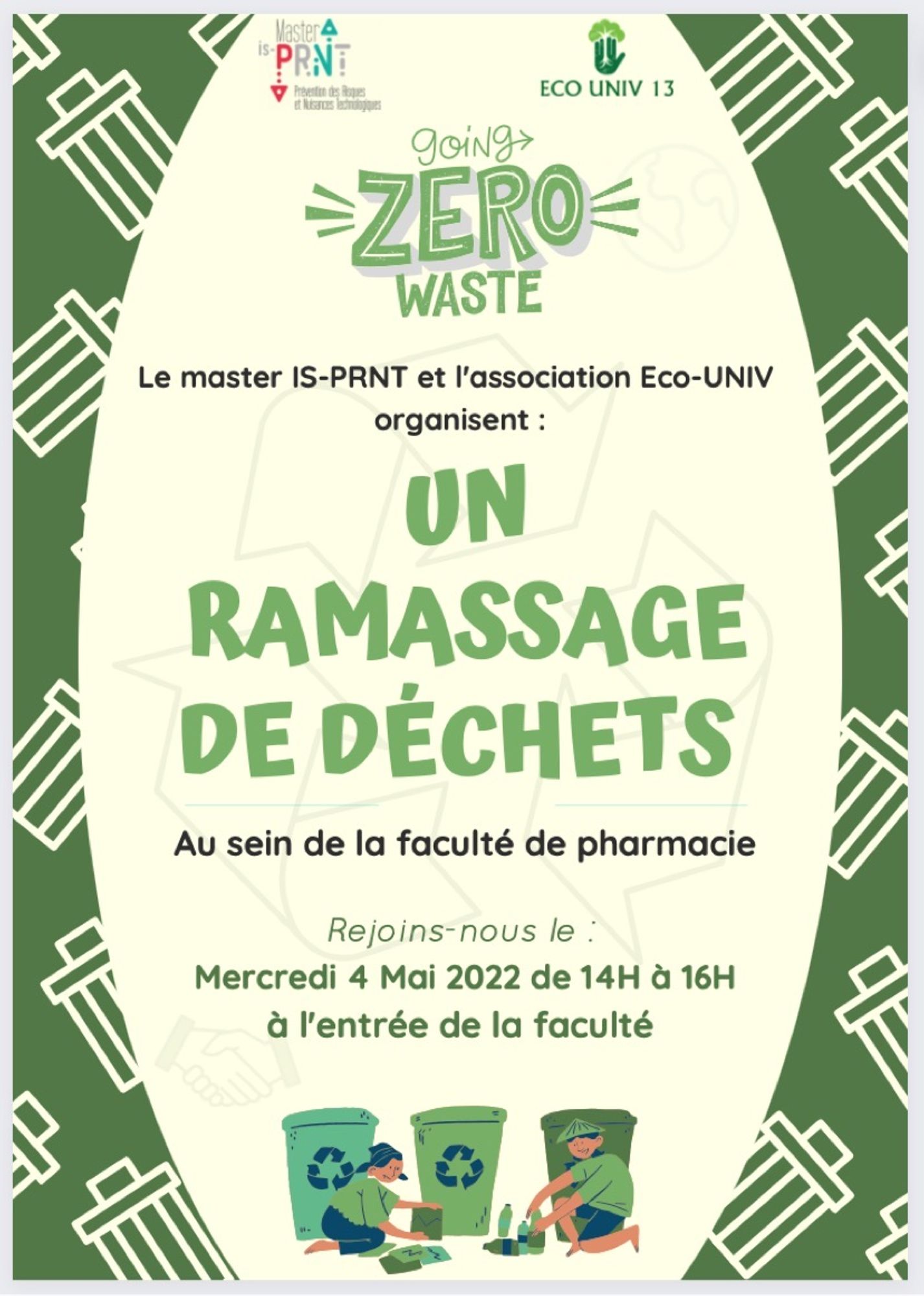 Le Master IS-PRNT et Eco-univ13 organisent un ramassage de déchets au sein de la Faculté de Pharmacie le 04 mai de 14h à 16h